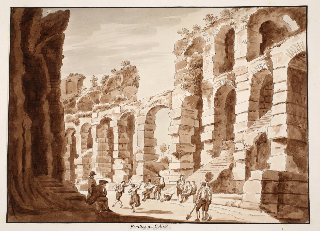 Colosseumin kaivaukset, 1883 (etsaus ruskealla pesulla)(Excavations in the Colosseum, 1883 (etching with brown wash))Agostino Tofanelli |