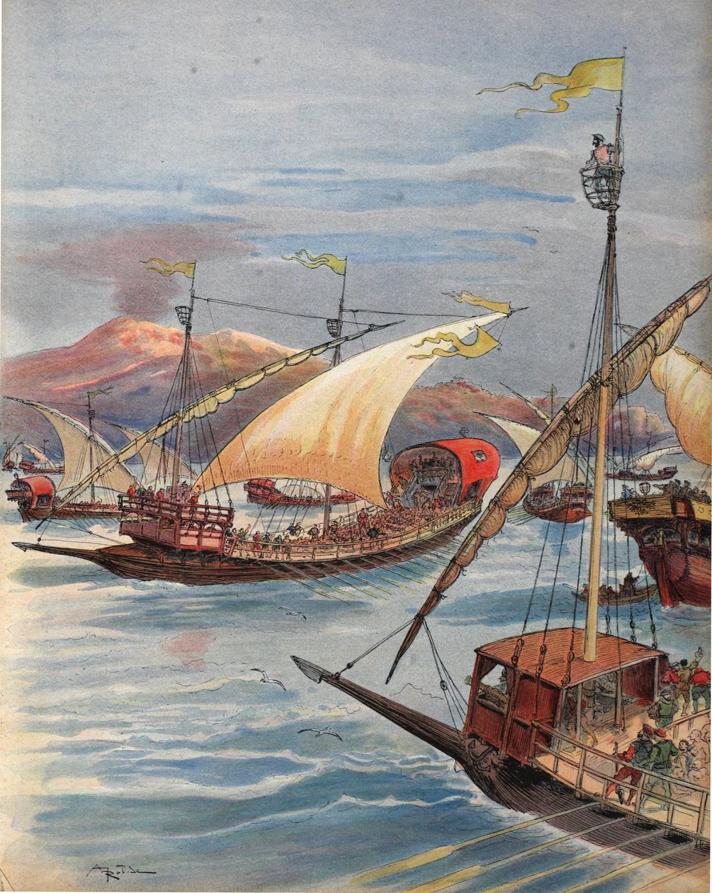 The Fleet of Doria, Napoli, kuvitus teoksesta 'Francois Ier: Le Roi Chevalier, kirjoittanut George G. Toudouze, pub. 1909(The Fleet of Doria, Naples, illustration from 'Francois Ier: Le Roi Chevalier, by George G. Toudouze, pub. 1909 )Albert Robida |