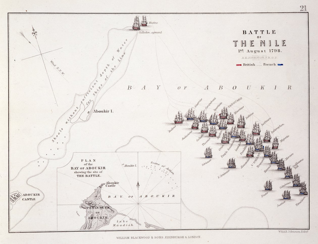 Niilin taistelun suunnitelma, 1. elokuuta 1798, noin 1830-luku(Plan of the Battle of the Nile, 1st August 1798, c.1830s )Alexander Keith Johnston |