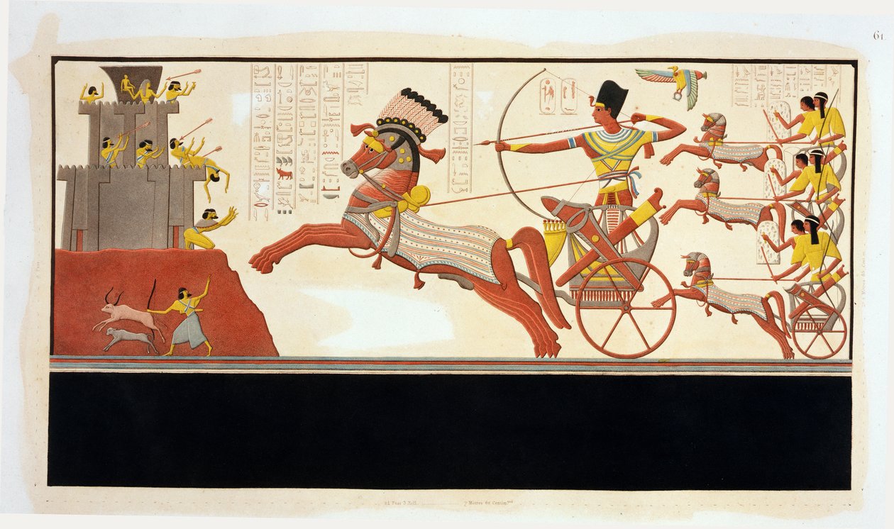 Ramses II (1279-13 eKr.) Kadeshin taistelussa, vastassa Heettiläisten kuninkaan Muwattalin armeijaa vastaan, seinämaalaus Ramses II:n temppelistä, Abu Simbel(Ramesses II (1279-13 BC) at the Battle of Kadesh, facing the army of Muwattali, King of the Hittites, wall painting from the Temple of Ramesses II, Abu Simbel )Bigant and Allais |