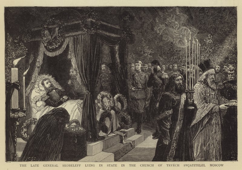 Edesmennyt kenraali Skobeleff makaa valtiossa Tryech Swjatitelein kirkossa Moskovassa(The Late General Skobeleff Lying in State in the Church of Tryech Swjatitelei, Moscow )Charles J. Staniland |