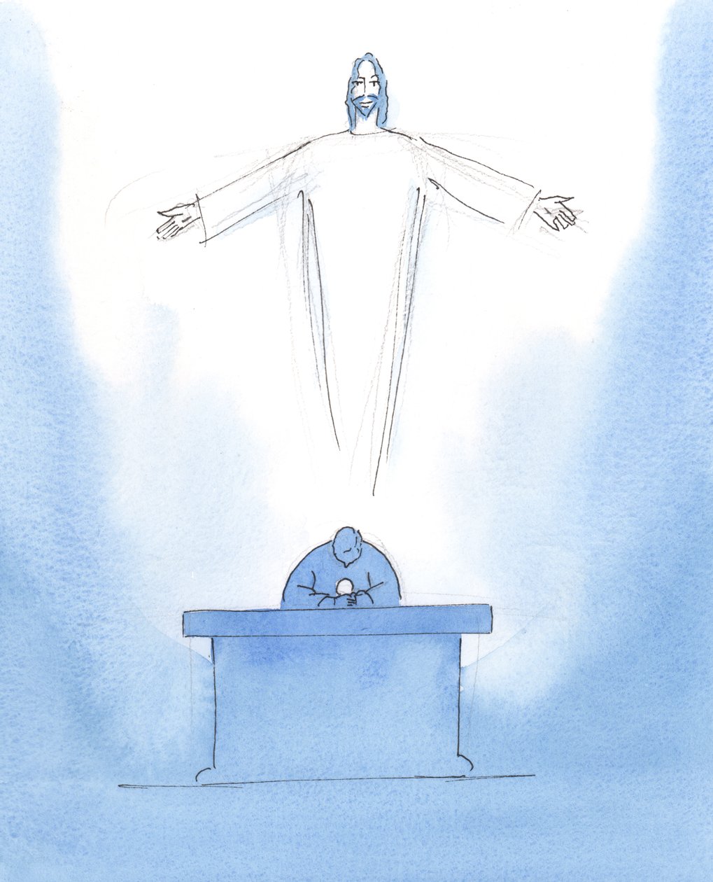 'Missä kaikki ovat Kristus 'ihmettelee' niin sanotusti (vaikka Hän tietää kaiken) - Missä ovat kaikki ne Hänen seuraajansa, jotka tunnustavat rakastavansa Häntä , 2005 (akvarelli paperille)('Where is Everyone? Christ 'wonders', so to speak (though He knows everything) - Where are all those followers of His who profess to love Him? , 2005 (watercolor on paper))Elizabeth Wang |