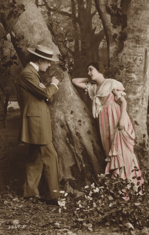 Pariskunta raapii nimikirjaimiaan puuhun(Couple scratching their initials into a tree )English Photographer |
