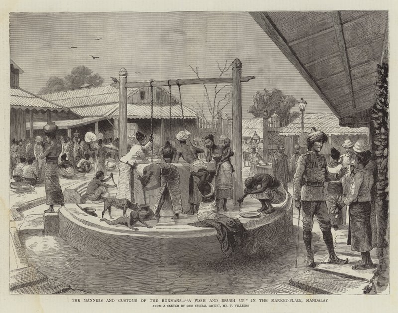 Burmanin tavat ja tavat, Pese ja Brush up in the Market-Place, Mandalay(The Manners and Customs of the Burmans, A Wash and Brush up in the Market-Place, Mandalay )Frederic Villiers |