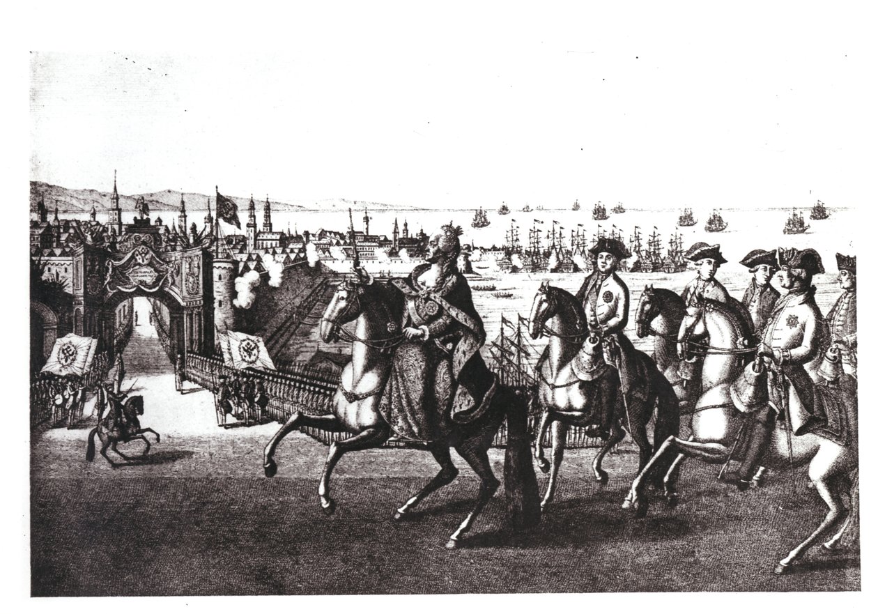 Katariina II (1729-96) Suuri ratsastamassa yhteen turkkilaisilta valloitetuista Krimin satamista.(Catherine II (1729-96) the Great, riding into one of the ports in the Crimea captured from the Turks )G. Baltazar |