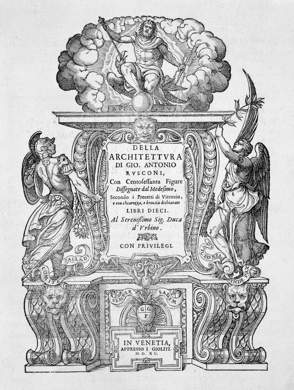 Vuonna 1590 julkaistun teoksen 'Della Architettura' nimiölehti.(Title Page of 'Della Architettura', published 1590 )Giovanni Antonio Rusconi |