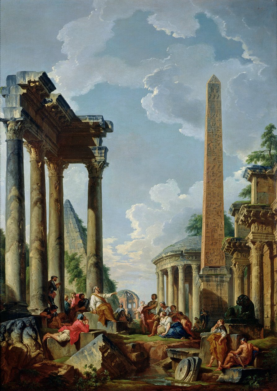 Arkkitehtoninen Capriccio saarnaajan kanssa raunioissa, n. 1745(Architectural Capriccio with a Preacher in the Ruins, c.1745 )Giovanni Paolo Pannini |