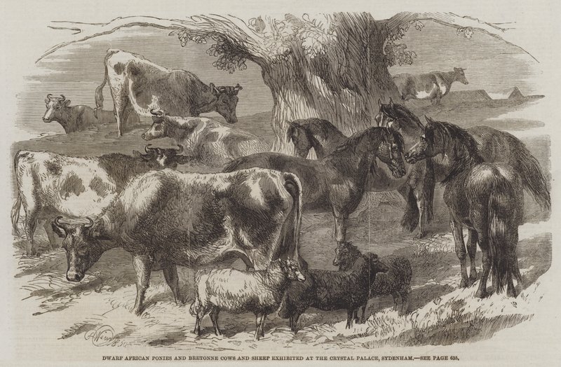 Kääpiöafrikkalaiset ponit ja Bretonnen lehmät ja lampaat näytteillä Crystal Palacessa Sydenhamissa(Dwarf African Ponies and Bretonne Cows and Sheep exhibited at the Crystal Palace, Sydenham )Harrison William Weir |