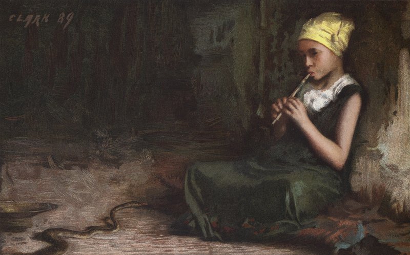 Tyttö hurmaamassa käärmettä (chromolitho)(Girl charming a snake (chromolitho))James (after) Clark |