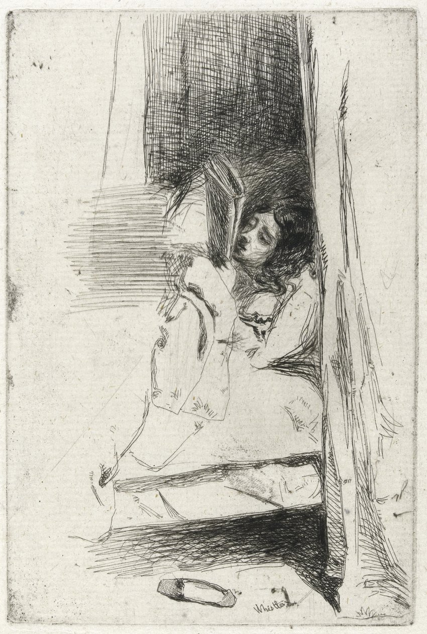 Reading in Bed (The Slipper) 1858 (musta hiilimuste antiikkipaperille)(Reading in Bed (The Slipper) 1858 (black carbon ink on Antique laid paper))James Abbott McNeill Whistler |