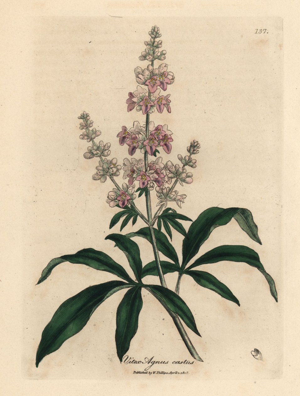 Vaaleanpunainen kukkainen puhdaspuu, Vitex agnus castus(Pink flowered chaste tree, Vitex agnus castus)James Sowerby |