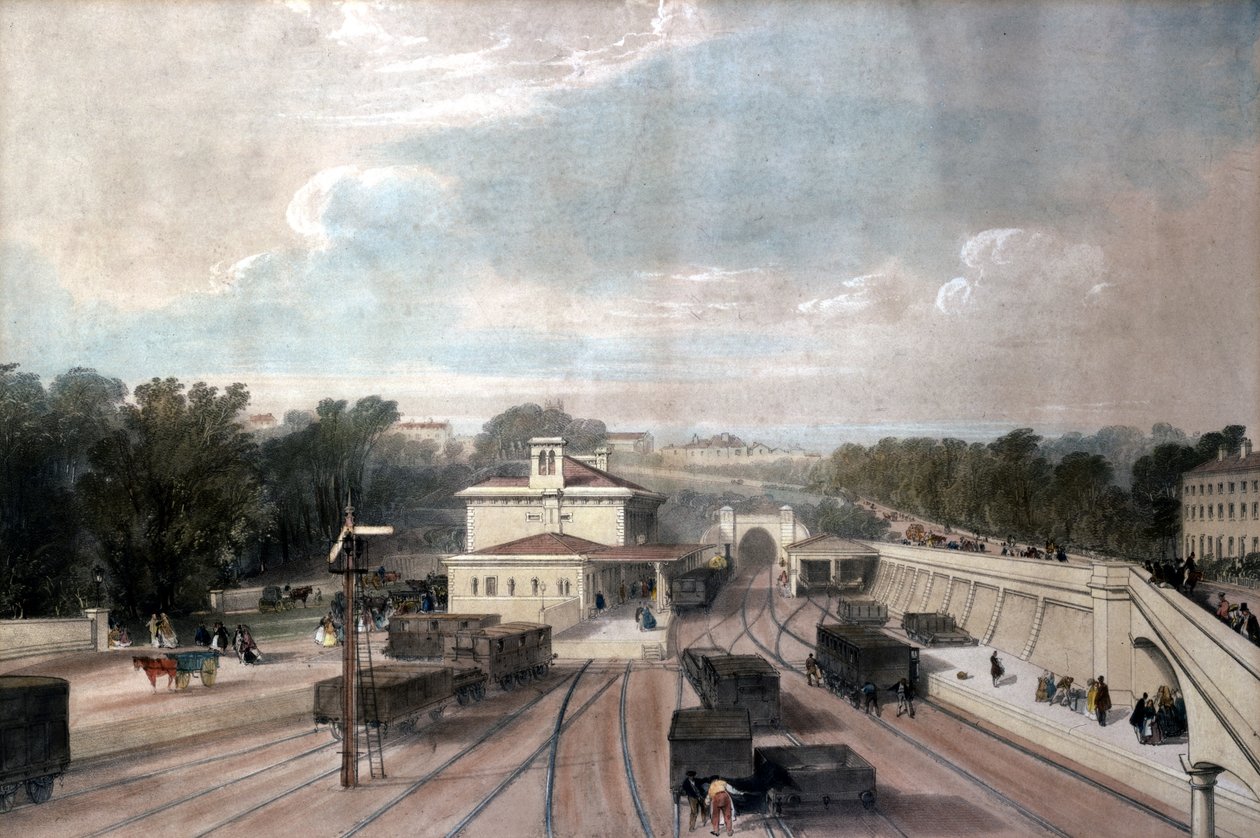 Tunbridge Wellsin rautatieasema, Kent, noin 1840-luku(Tunbridge Wells Railway Station, Kent, c.1840s )John Cooke Bourne |