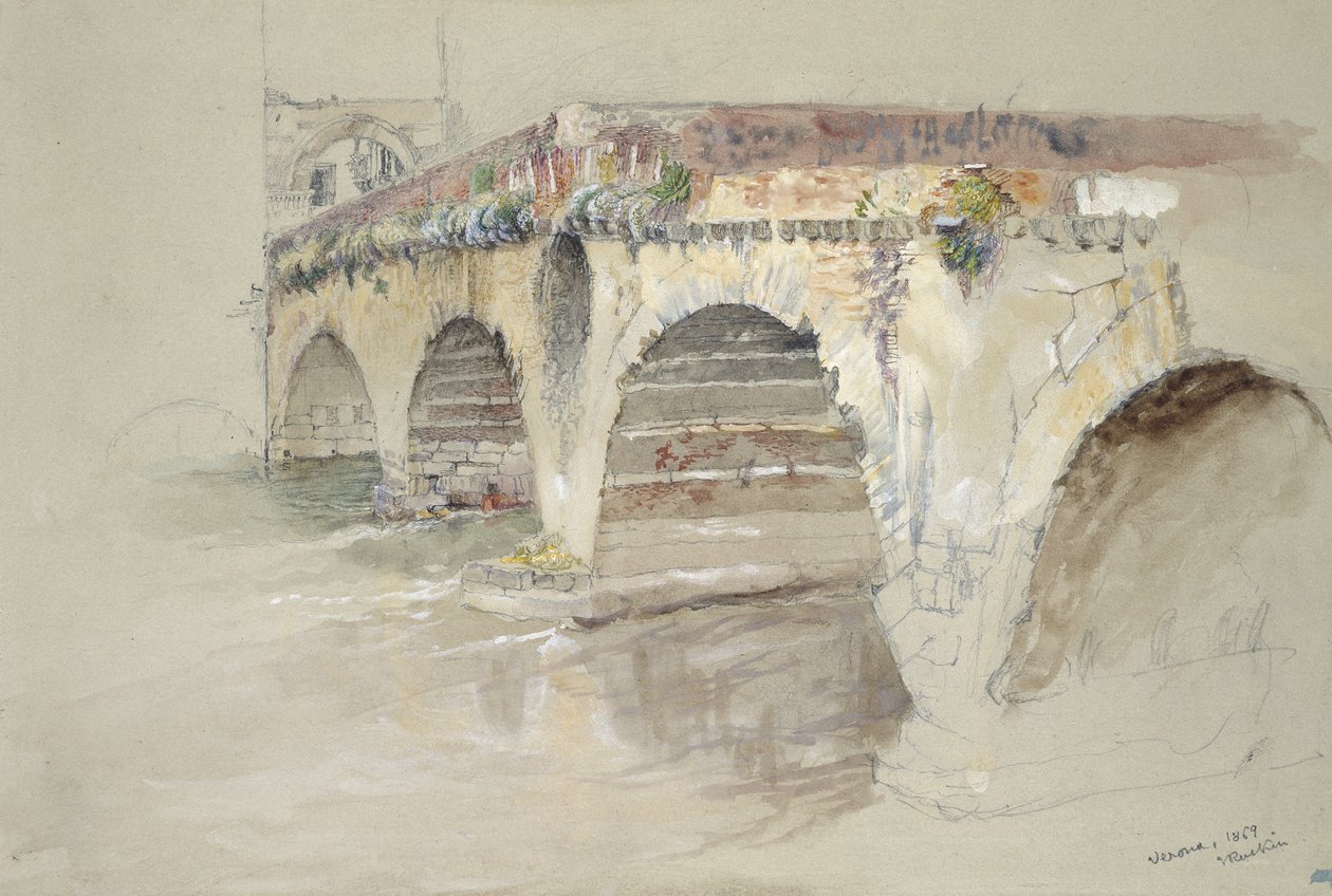 Ponte della Pietra, Verona, 14.-17.6.1869 (akvarelli ja vartaloväri grafiitin päällä harmaalla kudottupaperilla)(The Ponte della Pietra, Verona, 14 - 17 June 1869 (watercolour and bodycolour over graphite on grey wove paper))John Ruskin |