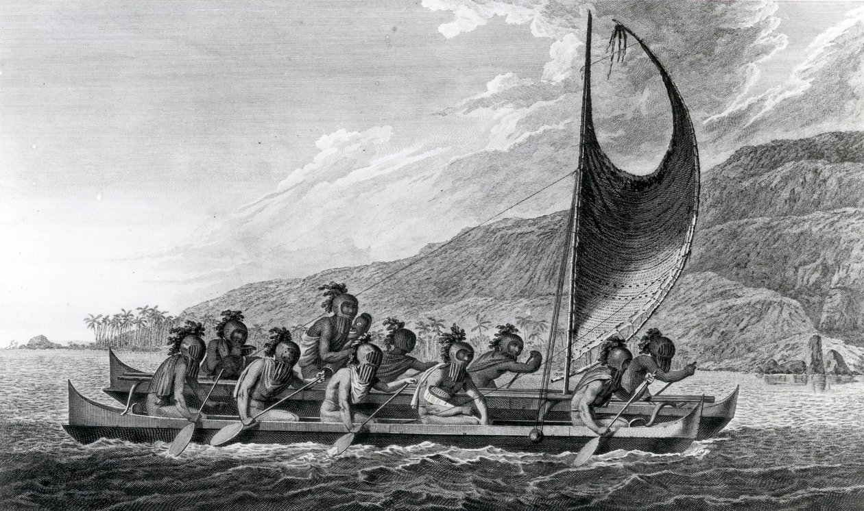 Sandwichsaarten kanootti, soutajat naamioituneina, 1784.(A Canoe of the Sandwich Islands, with the Rowers Masked, 1784 )John Webber |