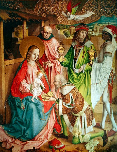 Maagien jumalointi, oikealla paneeli korkealta alttarin retablista, 1480(Adoration of the Magi, far right panel from the retable on the high altar, 1480 )Master of the Carnation |