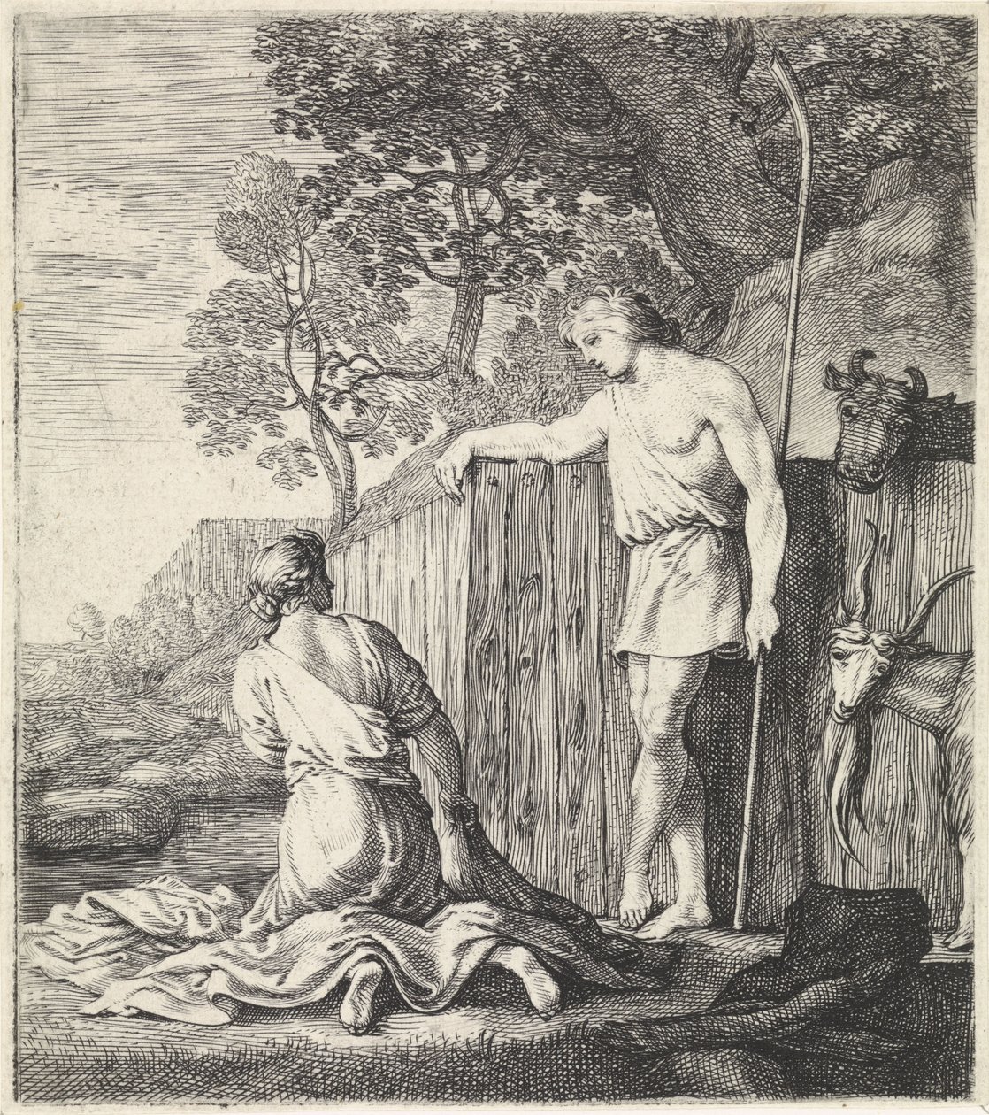 Pyykkimies ja paimen puron varrella(Wasvrouw en herder bij een beek)Moyses van Wtenbrouck(print maker) |