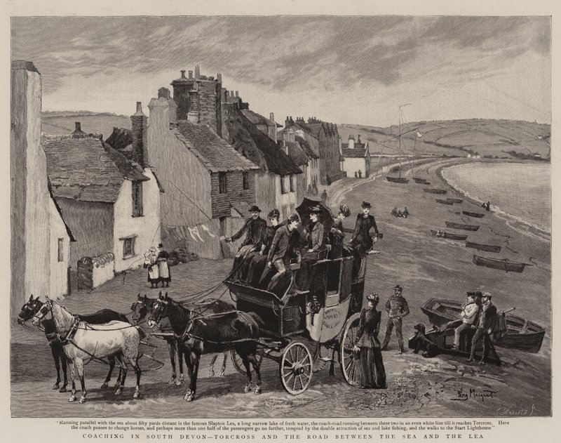 Valmennus Etelä-Devonissa, Torcrossissa ja meren ja Lean välisellä tiellä(Coaching in South Devon, Torcross and the Road between the Sea and the Lea )Percy Macquoid |