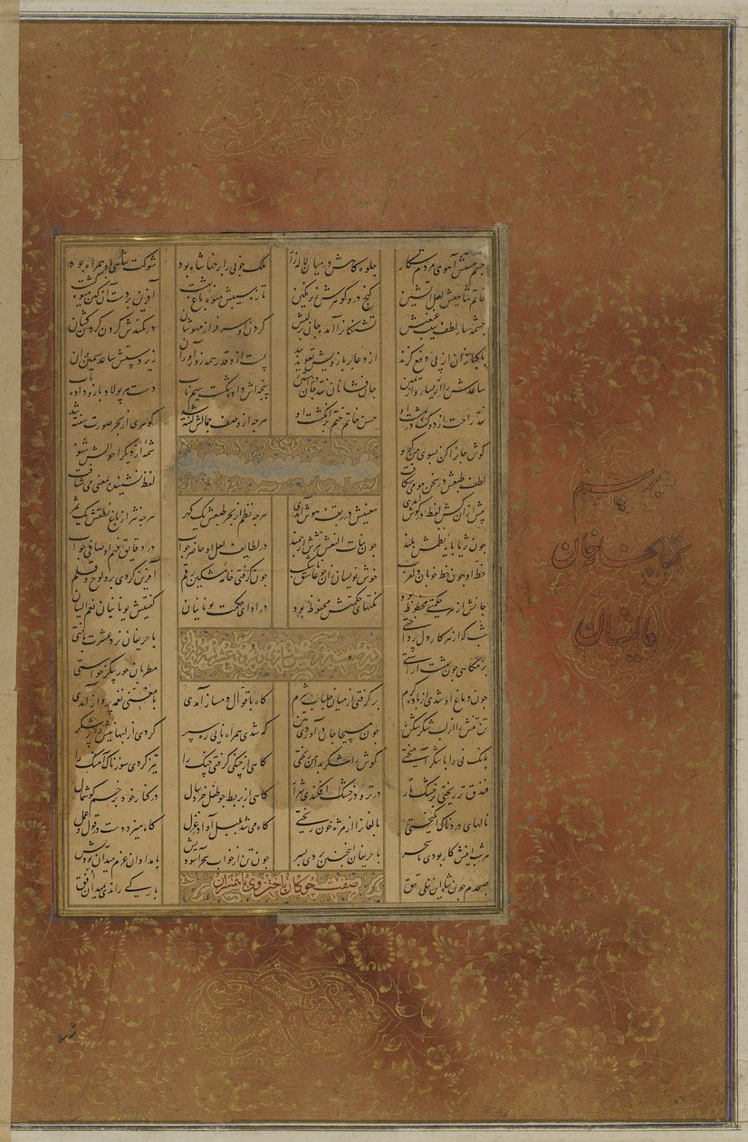 Shamsa eli pieni aurinko, Persian käännöksestä Apostolien ja Kuninkaiden Annals, jonka alun perin kirjoitti Tabari (n. 839-923) arabiaksi, 1470 Sivu Avicennan (Ibn Sina) lääketieteen kaanonista vuodelta 1632 Vastaanotto Kabulin kuninkaallisessa hovissa, Firdawsis Shahnamasta Khusraw Shirinin palatsin edessä Shahnamasta Enkeli Ruh pitelee taivaanpalloja, kuva Qazwinin Ajaib al-Makhluqatista (Luomisen ihmeet), n. 1550-1600 Persialainen puutarha, 1400-luku (wc paperilla) Ms D-184 fol.381a Persian kuninkaan palatsin sisustus, kuvitus "Shahnamasta" (kuninkaiden kirja), kirjoittanut Abu Ms d-212 Poolopeli miesten ja naisten joukkueen välillä, Nizamin "Khamsa", n. 1550 Ms.E-4322a Koraanin katkelma, 9. vuosisata, Abbasidien kalifaatti (750-1258) (pergamentti) Shah Abbas I (1588-1629) ja hovimies tarjoamassa hedelmiä ja juomia (yksityiskohta) Aatelisen tai kuninkaallisen hahmon muotokuva, mahdollisesti Muhammad Shah Qajar (muste ja läpinäkymätön wc norsunluun tai simpukan päällä) Lähikuva Tabriz Haji Jalili -matosta, Iran "Bizhan saa kutsun Manizhan sairaanhoitajan kautta", Folio 300v Shah Tahmaspin Shahnamasta (kuninkaiden kirja), n. 1525-1530 (läpinäkymätön akvarelli, muste, hopea ja kulta paperilla) Naiset ja lapset puutarhassa, 1800-luku Sindukht tulee Sam Bearing Giftsille, noin 1500-1540-luvulla