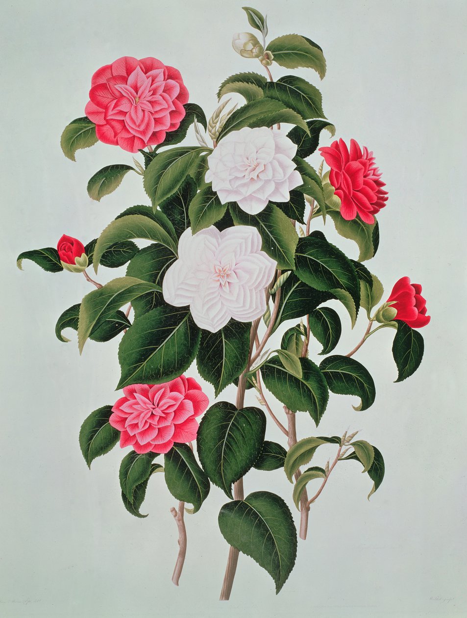 Camellia Japonica, kirjasta A Monograph on the Genus of the Camellia, 1819.(Camellia Japonica, from A Monograph on the Genus of the Camellia, 1819)William Curtis |