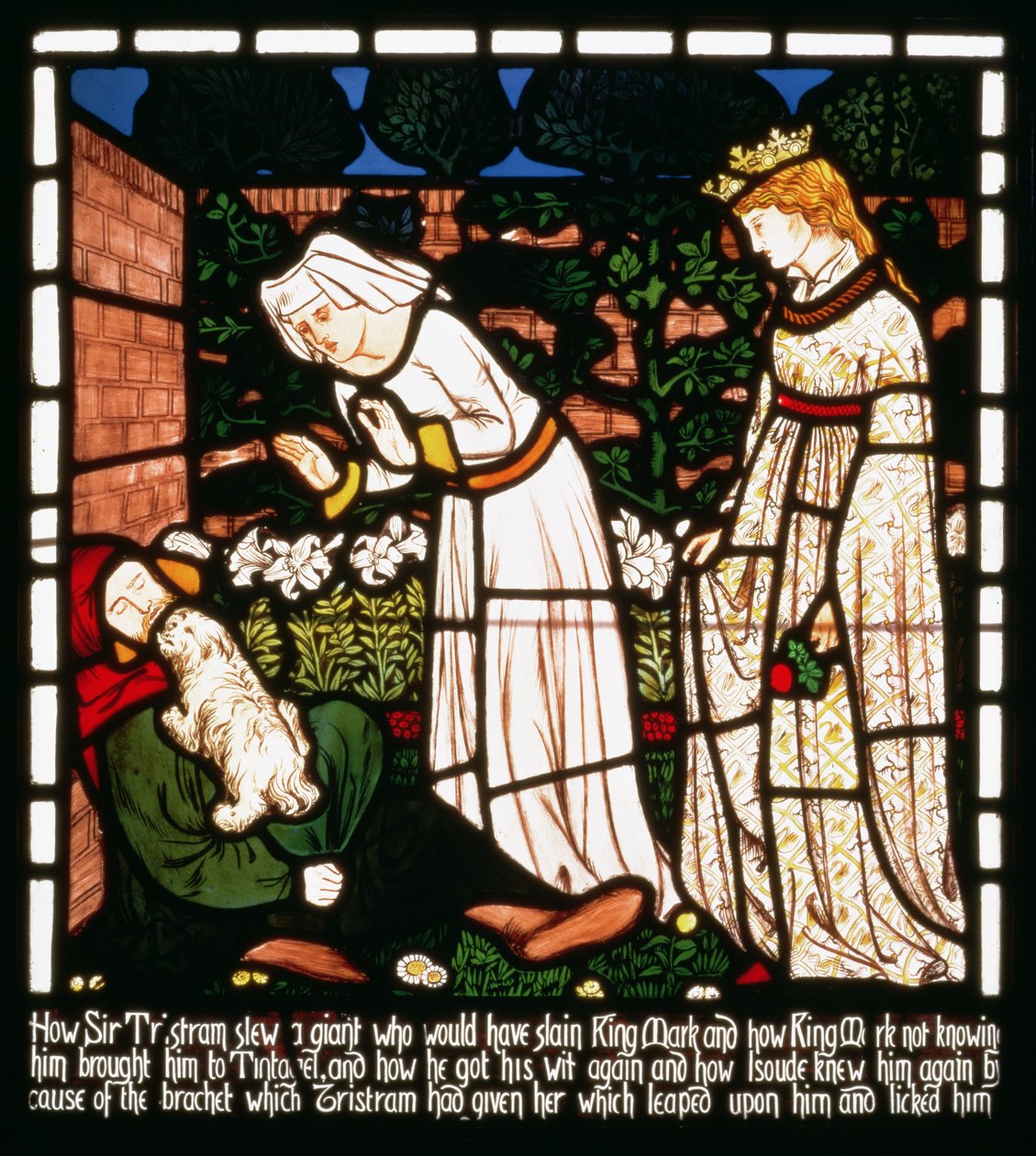 Sir Tristan on tunnustettu Isolde The Fair -koiralta, The Story of Tristan and Isolde, William Morris und Co. (lasimaalaus)(Sir Tristan is recognized by Isolde the Fair's dog, from 'The Story of Tristan and Isolde', William Morris und Co. (stained glass))William Morris |