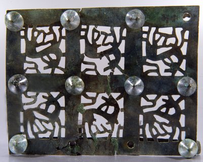 Leopardi, leijona ja koira hyökkäävät antiloopin, peuran ja vasikan kimppuun, yksityiskohta Tutankhamonin aarteeseen kuuluvan tikarin tupesta, n. 1340 eKr. kulta ja rauta katso myös 3979 ja 149453.