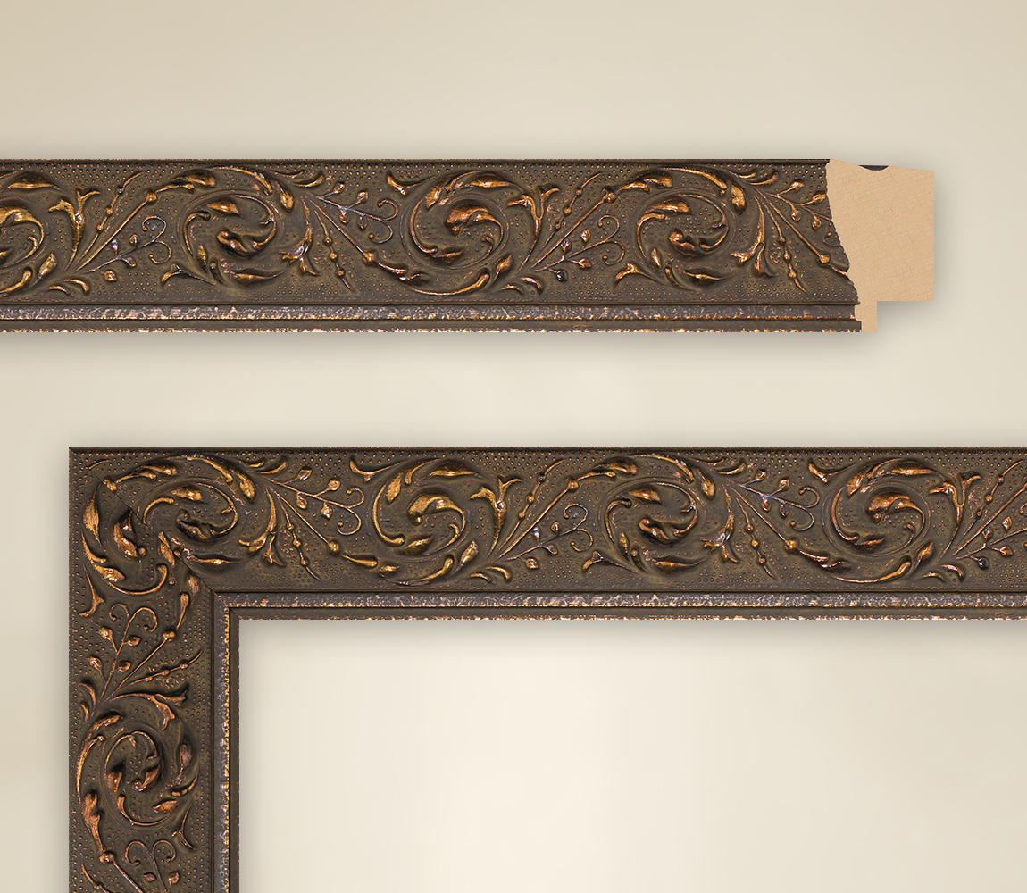 Minou-mallissa Tapestry-kehyssarja esittelee koristeilla koristellun pronssikehyksen, joka on yksinkertainen, mutta väriltään ja muodoltaan vaikuttava maalauksen kehys. Kehys työntyy huoneeseen 32 mm:n korkeimmalla kohdallaan aivan ulkoreunan kohdalta. Sen kokonaisleveys on 40 mm, johon suunnittelijat ovat sisällyttäneet yhteensä kaksi aluetta. Suurimman osan yläkuvasta vie yläpuolinen, paksu reunus koristeineen. Seinältä katsottuna tämä osa aidosta puusta valmistettuun verhoiluun tulee näkyviin ylöspäin kaartuvana kielekkeenä, joka tasoittuu matalassa kulmassa alaspäin. Maan alla on mattainen, keskiruskea pronssisävy, jossa on osittain kirkkaita vivahteita. Tämän lisäksi, alun perin myös melko taka-alalla, on pieniä metallisia pisteitä, jotka muistuttavat kuparikaiverrusta ja levittävät upeaa rakennetta. Niille on myös annettu kiiltävä vaalean pronssinen väri, samoin kuin muille niihin liittyville koristeille. Suunnittelijat ovat valinneet tähän kukkaelementtejä, joissa näkyy hyvin filigraaneja juonteita, joiden päät päättyvät siellä täällä sipulimaisiin nuppuihin. Niiden yleisilme on kuitenkin edelleen hyvin herkkä, sillä kudosten väliin on jätetty taitavasti paljon ilmaa. Kuvan sisätilojen päätteeksi on kapea, yksinkertainen kaksoispalkki. |