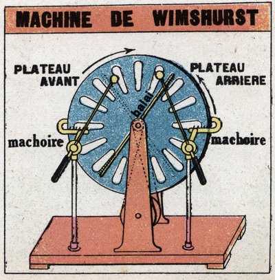 Staattiset koneet: Wimshurst-kone, sähköstaattinen kone, jonka James Wimshurst (1832-1903) keksi vuonna 1882. Anonyymi kuvitus vuodelta 1925. Yksityiskokoelma.