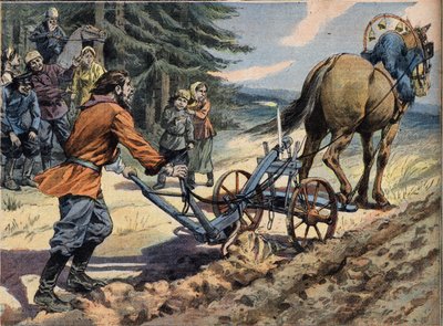 Ensimmäinen maailmansota 1914-1918 (14-18): Montenegron naiset kantoivat sodassa haavoittuneita miehiä keltin selässä tai omilla harteillaan. Kaiverrus "" Le Petite Journalissa" 12.5.1915. Yksityinen kokoelma.