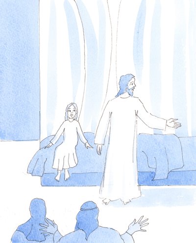 Osoittamalla huolenpitoa ruokaa ja juomaa tarvitsevista ihmisistä osoitamme sydämessämme olevan rakkauden - kuten Jeesus teki parantaessaan pienen tytön, 2005 (vesiväri paperille).
