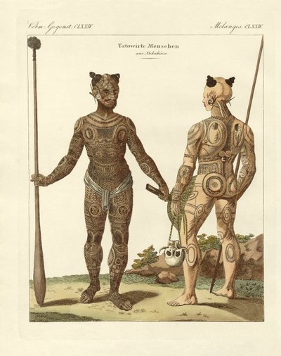 Two jugs fighting a duel (litho)