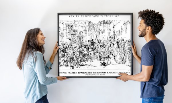 Avain herra Duncanin kuvaan Prinssi Charles Edwardista (1720-88) ja Highlandersista astumassa Edinburghiin Prestonin taistelun jälkeen 21. syyskuuta 1745, Baconin kaivertama (katso 10